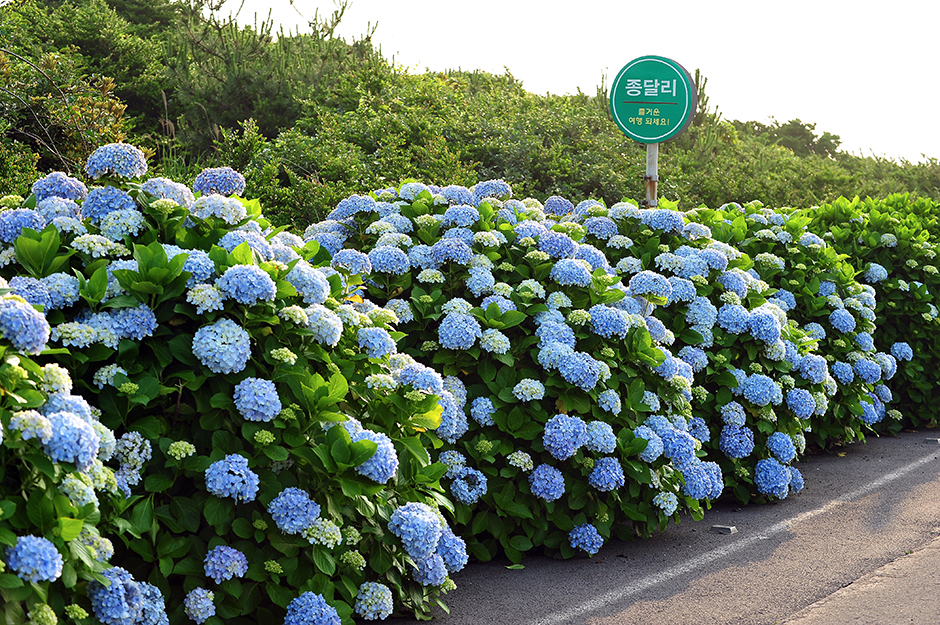 제주도 북동쪽 구좌읍에 자리한 조용한 마을 종달리에는 종달리 수국길이라는 테마 거리가 형성되어 있다. 종달리는 제주 국제공항에서 동부 방향으로 약 1시간 정도 거리에 있으며, 비자림을 지나 지미봉 자락에서 만나게 되는 마을이다. 보통 6월 중순에서 6월 말, 늦으면 7월 말까지 종달리 바닷길을 따라 형형색색의 수국이 만개한 모습을 볼 수 있다. 수국은 흙의 산도에 따라 하늘색에서 분홍색까지 색이 달라진다. 다만 이 테마 거리는 도로 한쪽으로 자전거도로 겸 인도가 마련되어 있지만, 차가 지나다니는 도로변이니 조심해야 한다.