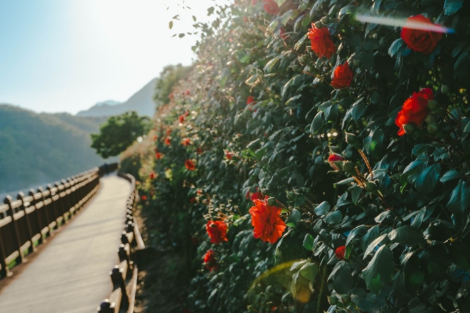 그 중 느림보강물길 4코스인 상상의거리는 고수대교 일대부터 소금정공원까지 일컫는 산책로이며 나무테크를 말끔하게 깔아 누구나 편하게 걸으며 수변의 다양한 꽃과 긴 장미터널도 볼 수 있으며 산 정상에 우뚝 솟은 만천하스카이워크가 한눈에 들어온다.
