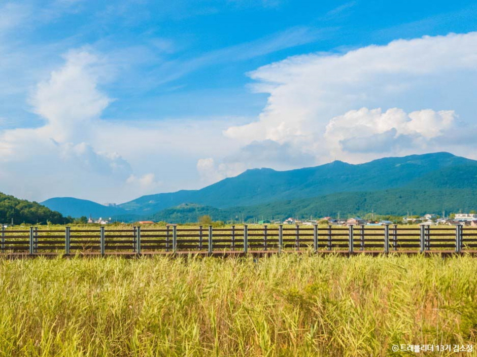 거제 오수마을 산촌 간척지에 위치하여, 탁 트인 전망의 자연과 고즈넉함이 공존하는 곳이다. 바다와 바다에 인접한 강이 조화를 이루며 멋진 자연경관을 보여준다. 억새밭 주변으로 산책로가 있어 잠시 산책하기에도 좋다. 억새와 갈대가 함께 피어있으며 호수 안에는 물고기들을, 갈대밭 사이로는 많은 새도 볼 수 있는 곳이다. 바다를 매립해 만든 간척지여서 어촌과 농촌의 풍경이 함께 보인다. 거제의 관광지로 인생샷을 얻을 수 있는 포토존으로 널리 알려져 가을에 특히 많은 사람 이 찾는 곳이다.