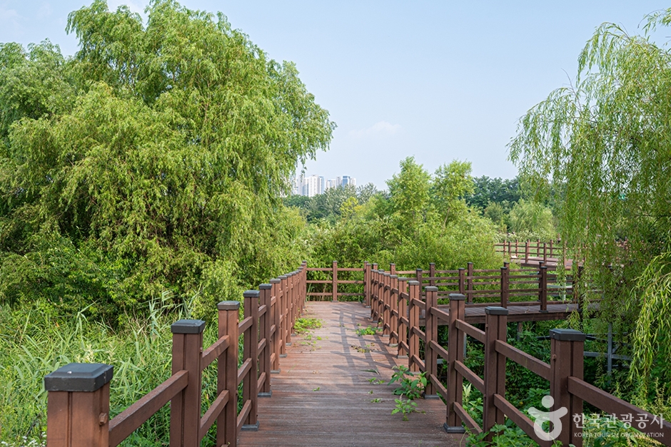 봉골저류지 둘레에 나무데크로 조성된 산책로가 있어 습지에 사는 식물들과 멸종 위기에 처한 생물들의 서식처 표지판을 볼 수 있다.