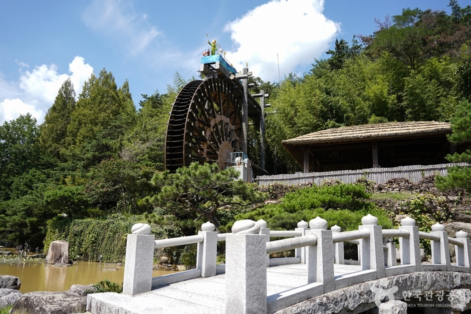 이 물레방아는 덕동호에서 수로를 타고 흘러내리는 자연 수압으로 돌아간다. 물레방아의 물받이가 108개로 백팔번뇌를 씻고 행복을 나누어 갖자는 뜻이라고 하며 주변의 대나무숲과 조화를 이루며, 인공 폭포와 작은 호수가 조화를 이루고 있는 공원이다. 봄이면 벚꽃의 만개로 상춘객들의 발길이 이어지는 곳으로 기념사진을 찍으며 즐거운 한때를 보내기에 좋은 곳이며 밤에는 오색조명의 화려함에 야간 사진 명소로도 유명하다. 보문호 관광단지 내 시설 보문호수, 목월공원도 있고 차로 5분 거리에 어린이들이 즐길 수 있는 경주 바니베어 뮤지엄과 경주엑스포대공원 등 다양한 볼거리가 있다.