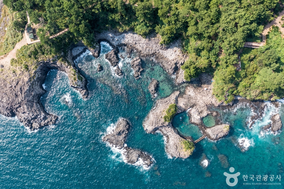 황우지선녀탕이라 불리는 제주도 천연 파도 풀장, 황우지 해안은 서귀포의 자연명소로 올레길 7코스에 속해 있으며 여름 물놀이, 스노클링 명소 및 포토스팟으로 알려져 있다. 차량을 주차하고 외돌개 해변 방향으로 내려가다 삼거리를 만나면 올레길 7코스를 따라 이어지는 길을 찾아가면 된다. 황우지는 무지개라는 뜻의 제주어 [황고지]에서 나온 말로, 무지개 모양의 둥근 해안 절경 때문에 황우지 선녀탕이라는 이름이 붙었다고 전해진다. 황우지해안은 완만한 만의 형태를 이루고 있고, 돌기둥처럼 선 바위들이 파도를 막아주는 형상을 하고 있다. 이곳은 스노클링 명소로 잘 알려져 있어 물놀이를 하러 많이 오지만, 바라보는 것만으로도 좋은 곳이다. 에메랄드빛의 투명한 맑은 바다와 푸른 하늘, 기암절경이 빚어낸 선녀탕의 인기는 여전하다.