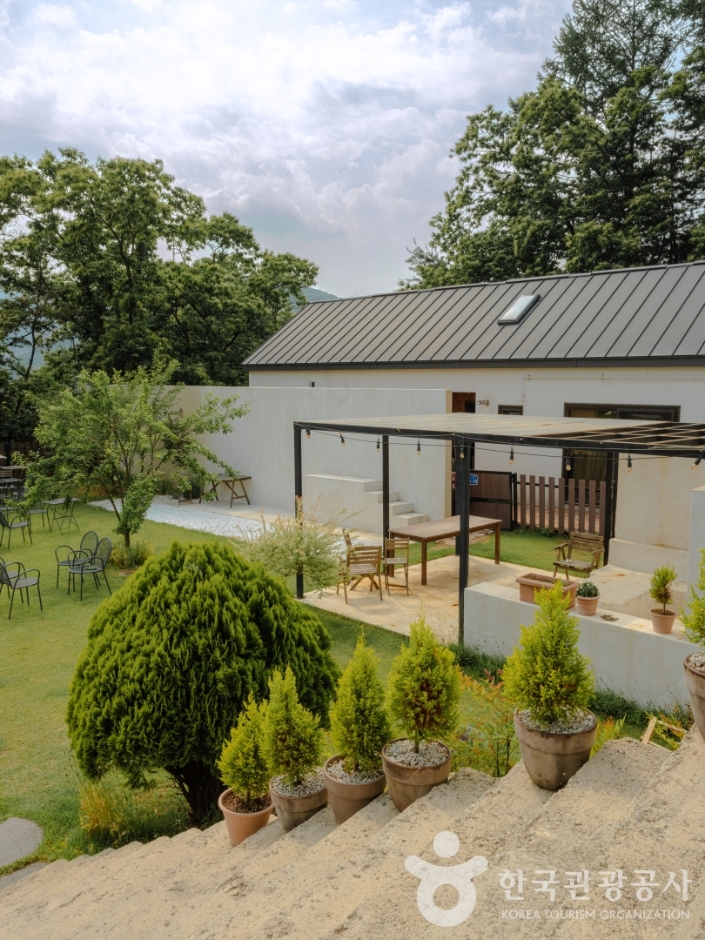 2층은 저 멀리로 산능선이 보이는 커다란 격자무늬 창이 사방으로 나 있는 아늑한 카페 공간이다. 언덕에 위치한 덕분에 앞이 가로막히지 않은 시원한 풍경을 감상할 수 있다. 어떤 계절, 어떤 날씨이든 핑계 삼아 오고 싶게 만드는 공간이다. 특히, 한쪽 벽면을 따라 배치한 좌식석은 1시간 이용제한이 있는 예약석일 만큼 인기있는 자리이다. 3층 옥상 루프탑은 개방형으로 되어 있어 야외에서 막힘없는 뷰를 감상하기에 제격이다. 시간의 여유가 있다면 공방 체험 후에 풍경화 같은 창가에서 향기 좋은 차 한 잔까지의 소박한 사치를 누리기에 좋은 곳이다.