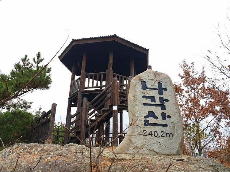 나각산은 산 전체가 소라를 닮았다고 해서 붙여진 이름이다. 240m로 높지 않은 산이라 30분 정도면 정상에 오를 수 있다. 정상엔 두 개의 봉우리가 있는데 각각 전망대가 있어 낙동강의 비경을 감상할 수 있고 그 사이로 30m 길이의 출렁다리가 설치되어 있다. 산을 오르다 보면 소원바위, 마귀할멈 굴 등 전설이 담긴 특이한 모양의 자연 조각상을 만날 수 있어 소소한 등산의 재미를 느낄 수 있으며 특히 산의 정기와 강의 기운이 뿜어져 나오는 마귀할멈 굴에서 소원을 빌면 이뤄진다는 이야기가 전해진다. 높지 않은데 경치가 좋아 백패커들의 성지로 알려진 곳이다.