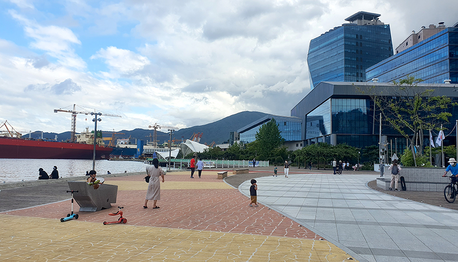 옥포 수변공원은 대우조선 오션플라자와 옥포동 주민센터 근처에 있다. 데크가 깔린 쾌적한 환경에서 시원한 바닷바람과 잔잔한 파도 소리를 들으며 운동을 하거나 산책을 즐기는 사람들이 많은 공원이다. 임진왜란 해전 승전지 기념비가 세워져 있으며 오페라하우스를 닮은 조형물이 있어 공연이나 그늘막으로 활용된다. 낚시를 즐기는 어른들과 자전거를 타는 아이들이 어우러지는 풍경에서 여유가 느껴진다. 근처에 옥포항, 옥포 중앙공원, 옥포대첩기념공원이 있어 주민들은 물론 관광객도 느는 추세다. 덕분에 골목 곳곳에 예쁜 카페와 맛집도 많다.