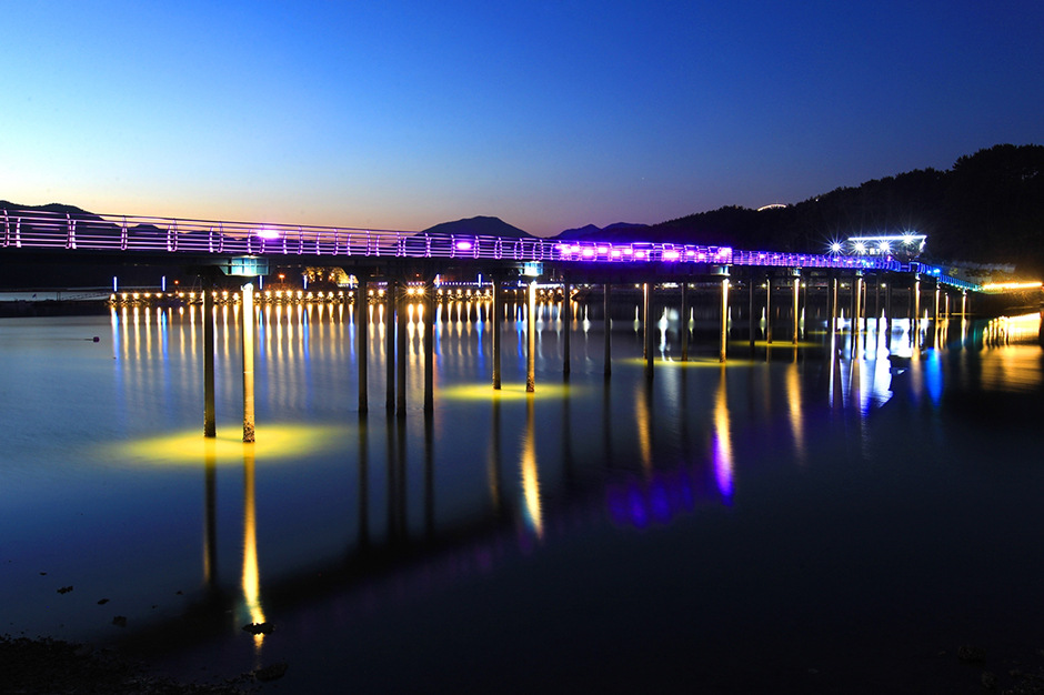 고성읍 신월리에 들어선 바다를 가로지르는 해지개다리는 “거대한 호수 같은 바다 절경에 해지는 모습이 아름다워 그립거나 사랑하는 사람을 절로 생각나게 한다”라는 의미를 담고 있어 연인들의 데이트 코스로 사랑받고 있다. 폭 3.5미터에 길이는 209미터 규모다. 또한 해지개 해안 둘레길은 남포항에서 남산 오토캠핑장, 해상데크교, 구선창까지 연결되어 있는 편도 1.4㎞ 구간으로 야간 경관조명시설을 설치해 밤 산책을 즐기는 사람들이 늘고 있다. 경관조명 점등시간은 일몰 후부터 11시까지다. 밤이 되면 반짝반짝 한층 더 아름다운 해지개다리를 걸으며 지쳐있는 몸과 마음을 치유해 보자.