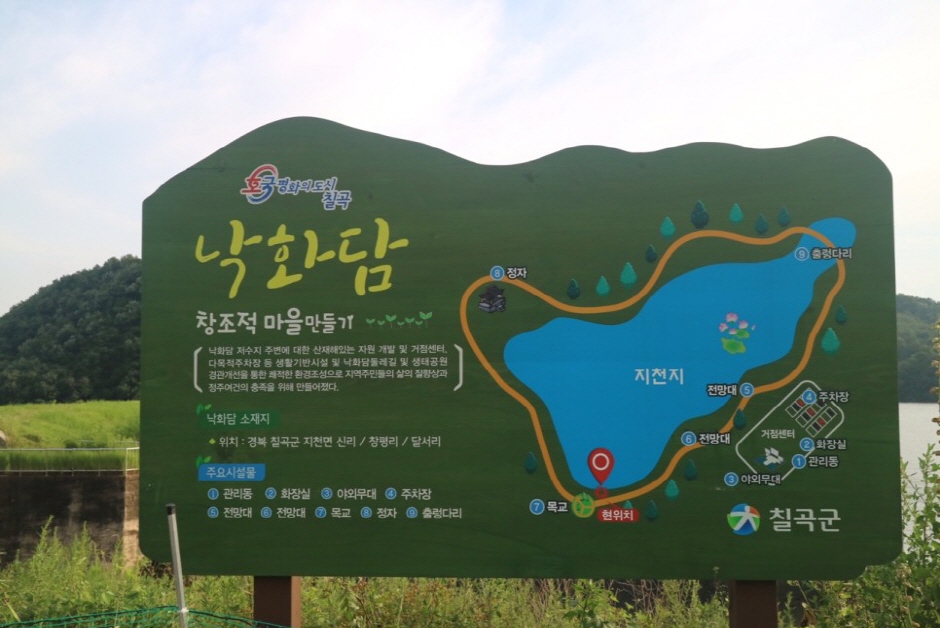 저수지를 한눈에 내려다볼 수 있는 낙화담이 있다. 저수지 근처에 자리 잡은 출렁다리를 건너 등산로를 타고 올라가면 닿는다.
