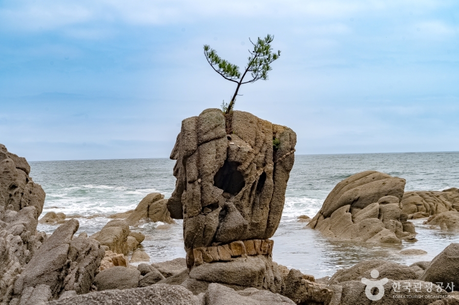 절벽 쪽 소나무 아래 마치 샌드위치처럼 바위 사이사이에 다른 내용물을 끼워 넣은 것 같은 층층 쌓인 신기한 모양의 바위는 서낭바위라 불긴다. 암석 속을 마그마가 뚫고 들어가 만들어진 것이라 한다. 또 다른 바위 위에 작은 돌멩이들이 올려진 바위가 있는데 자석 바위라고 불린다. 사람들이 신기한 듯 돌을 올려놓아 자석에 달라붙은 듯 보인다. 푸른 바다와 어우러진 여러 모양의 암석들이 신비로움을 자아낸다.