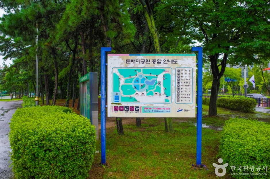 둔배미공원의 둔배미는 초지동에 있던 옛 자연마을로 고려 때부터 둔전과 둔전병이 경작하던 논배미가 있어 둔배미라고 불렸으며, 밀양박씨, 연일정씨, 천안정씨 등이 대대로 살았으나 지금은 도로가 개설되고 새로운 전원주택지가 조성된 지역이다. 둔배미공원 둘레에는 소나무로 울타리를 해 놓은 듯한 송림이 우거져 있고, 공원 한 바퀴를 산책할 수 있는 오솔길이 있으며 소나무 숲속엔 곳곳에 벤치도 설치되어 있어 휴식하기에 좋다. 돌로 만들어진 장기판과 바둑판, 앉아서 놀이를 할 수 있도록 낮은 의자가 설치되어 있다.