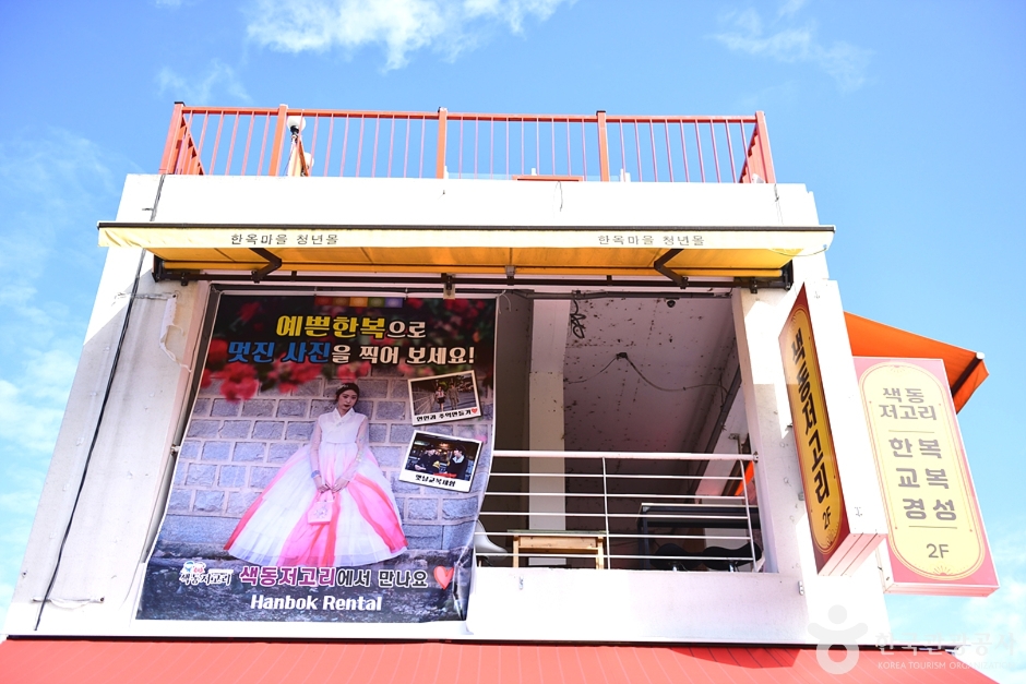 전주 한옥마을 한복 색동저고리는 전주 한옥마을 안에 위치한 의상 대여점으로 한옥마을 제1공영주차장에서 도보 1분 거리에 있어 찾아가기 쉽다. 전통 한복부터 경성의복, 교복, 아기 한복, 어우동 한복 등 다양한 종류의 의상이 준비되어 있으며 치마를 먼저 고르면 직원이 그에 어울리는 저고리를 추천해 주며 머리 손질과 액세서리까지 모두 제공해 준다. 치마의 종류가 많아 고르는 데 시간이 많이 소요되므로 방문하기 전에 미리 어떤 컨셉의 의상을 착장할지 정하고 가는 것이 좋다. 시간제 대여와 종일 대여가 있으며 사전에 온라인으로 예약할 경우 할인된 가격으로 이용할 수 있으니 참고한다.