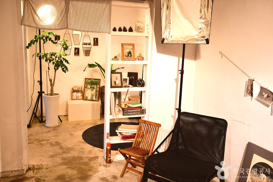 지하 1층에 마련된 사진관은 아늑한 공간을 채우는 감성적인 인테리어로 대기하는 동안 셀프 촬영하는 재미도 있다. 경기전 옆 사진관은 베이지, 다크, 라이트의 세 가지 컨셉으로 촬영을 진행한다. 베이지 컨셉은 따뜻한 톤의 사진으로 15분 동안 100컷 정도의 촬영이 이루어지며, 다크 컨셉은 8분간 50컷으로 묵직하고 고급스러운 느낌의 사진을 원하거나 오래 두고 남기고픈 흑백 사진 촬영이 진행된다. 라이트 컨셉은 3분에 대략 20컷으로 빠른 속도로 진행되는 촬영과 밝고 가벼운 느낌의 색감을 원하거나 부담 없이 찍고 싶을 때 이용하기에 좋다. 세 종류 모두 기본적인 보정 작업이 이루어지며 현장에서 인화까지 이루어져 바로 사진을 받아볼 수 있다. 숙련된 사진 기사의 노하우로 진행되는 촬영은 시종일관 편안한 분위기에서 자연스러운 연출을 유도해 기대 이상의 만족스러운 사진을 남길 수 있다.