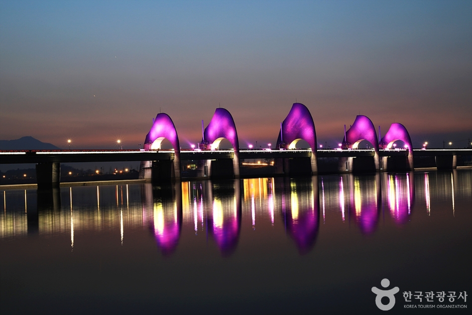 승촌보교는 승촌보 위로 차량과 사람이 모두 통행하는 교량이다. 승촌보교 위의 조형물은 나주평야의 쌀을 형상화 해 놓은 것인데 가까이서 보는 것보다 상류에 있는 승용교에서 정면이 아닌 대각선으로 바라보면 쌀 형상과 비슷함을 느낄 수 있다. 또한 승용교에서 바라보는 승촌보의 노을을 감상하는 맛도 좋다.
