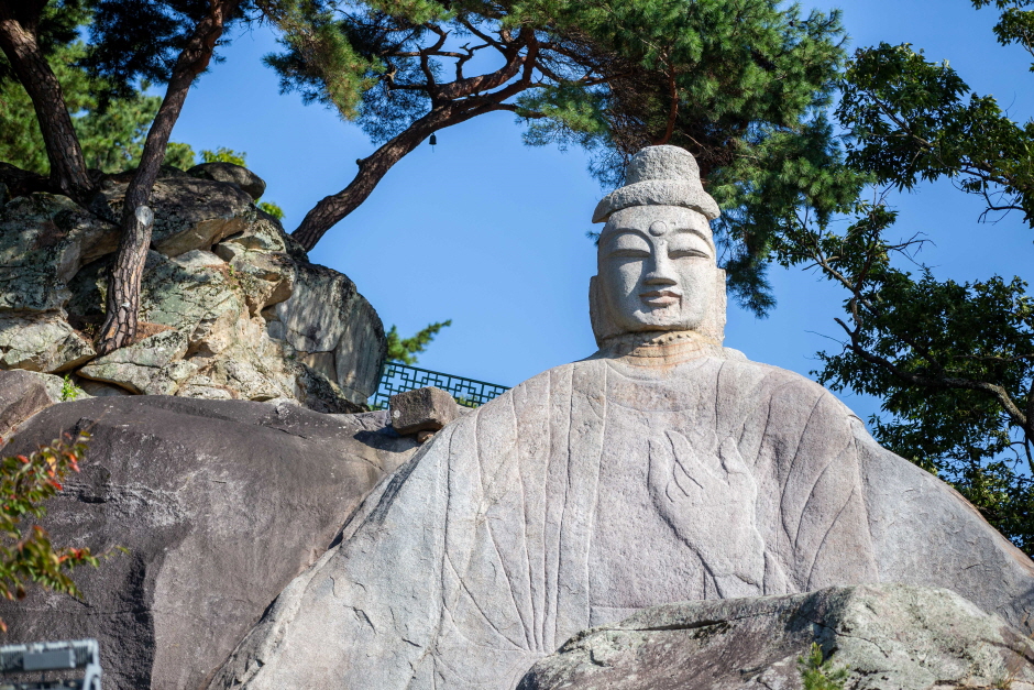자연 암벽에 불신을 새기고 그 위에 머리는 따로 제작하여 올려놓은 거구의 불상이다. 자연석에 머리 높이 2.43m, 전체높이 12.38m의 석불을 조각하였다. 몸체의 선각과 얼굴의 뚜렷한 인상이 매우 대조적이다. 머리의 육계가 큼직하고 윤곽이 뚜렷하여 매우 개성이 있는 모습이다. 몸체를 이루는 자연 암석도 위압적이지만, 입을 꾹 다물고 눈에 힘을 잔뜩 준 모습이 매우 권위적이며 힘이 있어 보인다. 눈, 코, 입의 선이 각지고 매우 뚜렷하여 이목구비가 분명한 인상이다. 자연 암석으로 이어진 목에는 삼도가 희미하게나마 새겨져 있다. 얼굴의 강한 윤곽이나 세부적 조각 양식으로 보아 11세기 무렵에 제작된 불상으로 추정되며 국가 보물로 지정되었다.