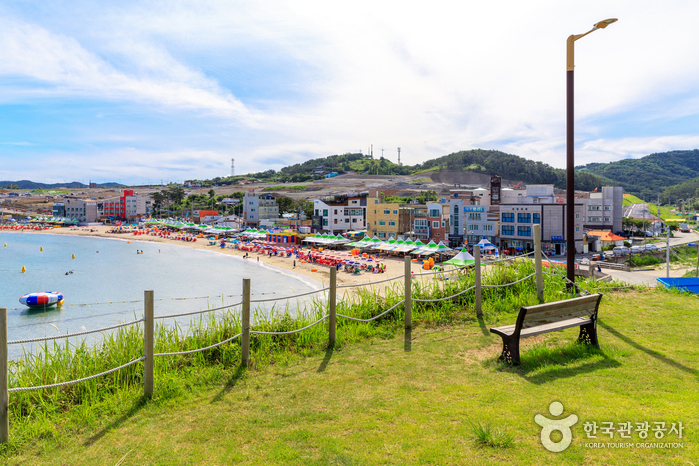 반달형의 백사장은 길이 400m, 폭 50m나 되어 야영을 즐기는 피서객들이 선호한다. 해수욕을 할 수 있는 구역과 수상레포츠를 할 수 있는 곳이 분리되어 안전하게 바나나보트, 모터보트, 제트스키 등 수상 레포츠를 즐길 수 있으며, 오징어 맨손잡기 축제도 진행된다.