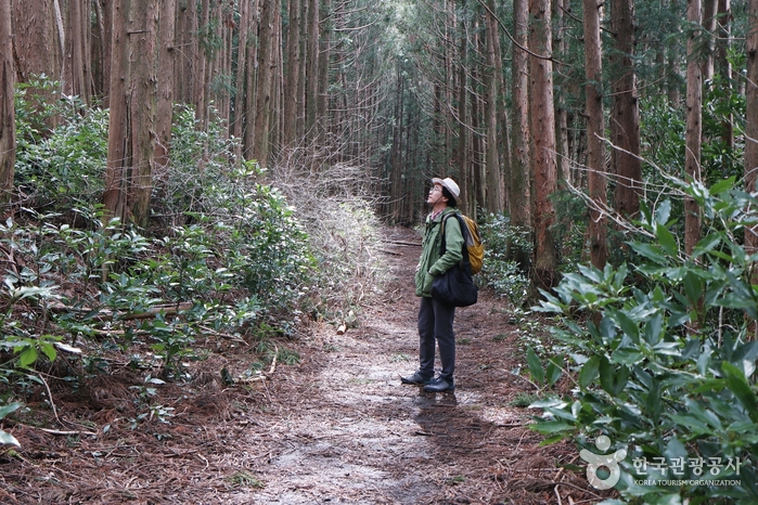 오름 입구에서는 정상으로 가는 길과 둘레길로 돌아갈 수 있는 길이 있는데, 둘레길을 통해 오름을 다 보는 데 최대 1시간 30분 정도 소요된다. 입구 초반 자연 그대로의 삼나무 숲길과 굼부리 내부까지 들어가 오름의 속살을 느끼면서 걸을 수 있는 것이 이곳의 매력이다. 이 오름은 개인 사유지로 도민과 관광객을 위해 부분적으로 개방한 곳이니, 승인된 등산로로만 다녀야 한다.