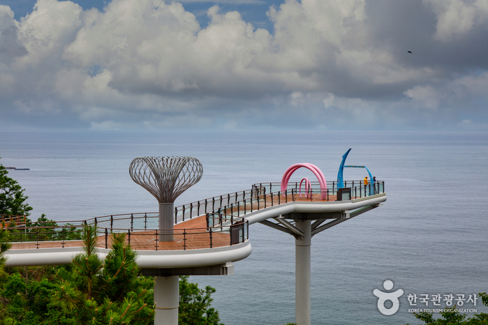 도째비는 도깨비의 방언이다. 도깨비방망이를 형상화하여 바다를 조망할 수 있는 85m 길이의 해상보도 교랑이다. 해랑은 바다와 태양 그리고 내가 함께 하는 공간을 의미한다고 한다. 입구에는 도깨비 영역으로 들어가는 의미를 가진 파란색 진입 터널이 있고, 가운데 조형물은 도째비골 스카이밸리 전망대의 봉오리 진 슈퍼트리가 도깨비방망이를 통해 만개했다는 스토리를 조형화했다. 배를 타야만 닿을 수 있는 바다 위 파도를 발아래서 느낄 수 있도록 유리바닥과 메쉬바닥으로 구성한 해상 교량이다.
