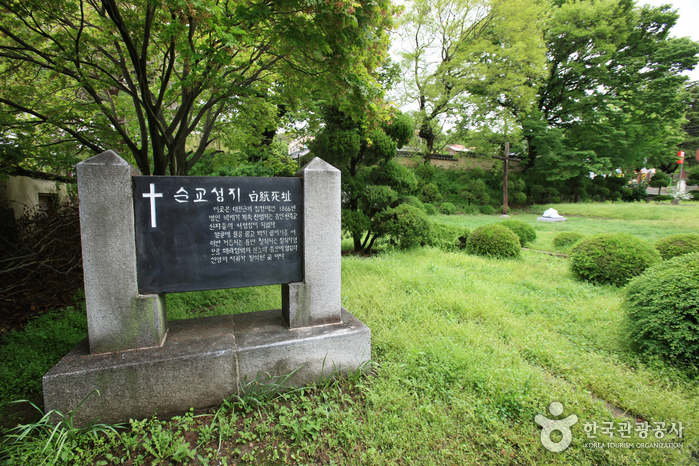 백지사터는 병인박해 당시 전라도 여산군의 속읍이었던 고산, 금산, 진산 등의 천주교 신자들이 순교한 장소이다. 이곳을 백지사터라고 부르는 이유는 천주교 신자들의 처형 방법에서 유래한 것으로 천주교 신자들의 처형 방법이 얼굴에 물을 뿜고 백지 붙이기를 여러 번 거듭하여 질식사시키는 백지사(白紙死)였기 때문이다.