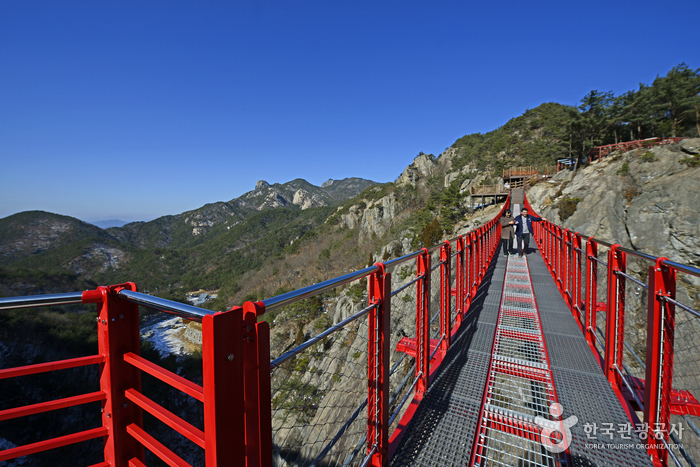 해발 620m에 설치된 출렁다리는 등산로가 상봉과 마장재로 갈리는 지점에 있다. 깎아지른 협곡을 세 방향으로 연결한 국내 유일의 산악 보도교다. 지상 높이 60m, 총 길이 109m다. 최대 하중 60t, 75kg 어른 800명, 동시 최대 수용 인원은 230명이다.