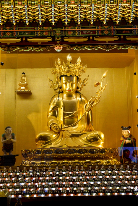 양손에는 꽃봉오리가 달린 연꽃가지를 잡고 있다. 이마 위에서 시작되는 큰 귀를 가졌고 상호는 원만하다. 약간 앞으로 구부린 자세에서 두 손 모두 첫째와 셋째 손가락을 대고 넷째 손가락을 구부린 상태로 연화봉을 들고 있다. 목에는 삼도가 표현되어 있고 가슴에 영락장식은 없다. 법의는 두꺼운 통견을 하여 배 위에서 U자형을 그렸고, 양팔과 결가부좌한 다리를 의문이 덮고 있어 발은 보이지 않는다. 조선시대 세조의 상원사 비호와 관련되어 조성된 것으로 보여진다 .