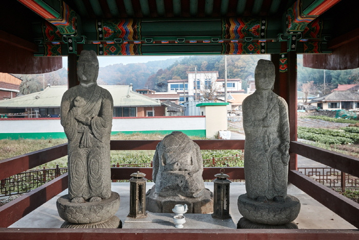 대사골로 불리는 마을 앞에 3구의 불상이 남아 있어서 하나의 석불군을 이루고 있다. 좌우 측면의 불상은 다른 불상의 협시보살로 만들어졌을 것으로 추정되는데 2구의 보살입상은 손모양만 다를 뿐 조각수법이 거의 비슷하다. 머리에는 두건 같은 높은 관을 쓰고 있으며 길쭉한 얼굴에 눈, 코, 입이 평판적으로 표현되었다. 우리나라 고유의 한복 같은 옷을 입고 있는데, 두껍고 무거운 느낌이다. 어깨의 매듭과 양 무릎에서 시작된 타원형의 옷주름은 불상의 가장 큰 특징이다. 이런 표현들은 고려시대 지방화된 불상양식에서 보이는 석조보살상들의 특징이다. 대좌(臺座)는 상대와 하대로 나누어지는 2단으로 되어 있으며 연꽃이 새겨져 있다. 그 아래 8각의 단에는 각 면마다 귀꽃을 표현해 놓아 통일신라 초기 양식을 계승한 것으로 보인다. 두 보살입상 사이의 중간에 놓인 머리가 없는 좌불상은 온몸에서 나오는 빛을 형상화한 광배(光背)의 양식으로 보아 고려시대의 불상임을 확인할 수 있다.