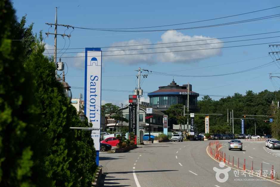 춘천 산토리니는 정통 이탈리안 레스토랑이자 전망 좋은 카페로 유명하다. 고급스러운 인테리어, 소규모 웨딩과 연회가 치러지는 예쁜 야외 잔디밭, 포토존으로 유명한 소원의 종탑이 설치되어 있으며, 춘천 시내가 내려다보이는 위치에 있어 전망이 매우 좋다. 카페테리아, 베이커리, 이탈리안 피자와 파스타 등 가볍게 먹고 마시면서 쉴 수 있는 공간이다.