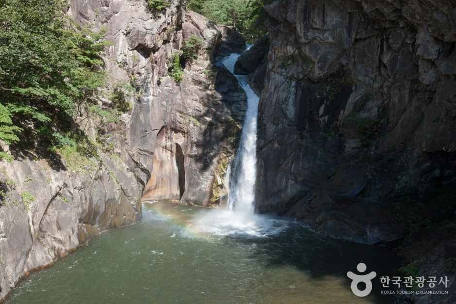 삼부연폭포는 철원 9경 중 하나로, 명성산(870m) 중턱의 화강암 지대에 위치한 높이 약 20m 규모의 3단 폭포이다. 중생대 백악기에 관입한 화강암이 지표에 드러난 이후 흐르는 물에 의해 오랜 기간 침식되어 만들어졌다. 이곳은 한탄강 지질공원에 속하고, 유네스코 세계지질공원으로 인증되었다. 삼부연폭포는 물줄기가 세 번 꺾여지고 폭포 하부의 가마솥처럼 움푹 팬 웅덩이가 세 개 있어서 삼부연(三釜淵)폭포라 불리며, 삼부연이라는 이름은 조선시대 성리학자이자 시인인 김창흡이 이곳을 방문하고 석 삼 <三>과 가마 부 <釜>와 못 연<淵>을 써서 이름 지었다고 전해진다. 조선시대 진경산수화의 대가인 겸재 정선이 삼부연폭포의 뛰어난 경관을 화폭에 담은 '삼부연도'가 지금도 전해지고 있다. 삼부연폭포를 관람하려면 주차장에서 터널을 통해 전망대까지 걸어가야 하며, 전망대에서는 폭포의 장관을 가까이에서 볼 수 있다.