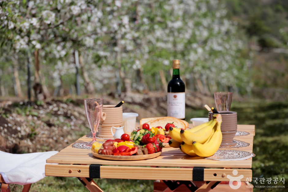 대표체험은 사과나무 아래에서 즐기는 팜크닉이다. 사과 꽃이 만발한 사과밭 한가운데서 즐길 수 있다. 팜크닉에서는 임실의 대표적 특산물 중 하나인 임실치즈를 이용한 퐁듀를 즐길 수 있다. 치즈를 녹이는 퐁듀 그릇과 치즈에 찍어 먹는 여러 가지 음식 재료 그리고 와인이 마련되어 있다. 사과 외에도 딸기, 소시지, 떡갈비 등 음식재료에 따라 치즈 맛을 다양하게 즐길 수 있다. 퐁듀 외에도 사과를 이용한 사과밥피자 만들기, 사과고추장 만들기, 사과고추장 닭갈비 만들기 등 다양한 먹거리 프로그램을 운영한다.
