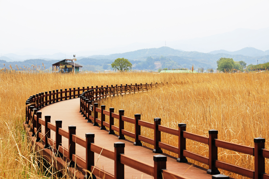 ‘연어의 모천’이라 불리는 양양 남대천의 자연을 관찰할 수 있는 생태 여행지다. 낙산대교 근처, 남대천 물길이 동해로 흘러 들어가는 하류에 조성되어 있다. 남대천 생태관찰로는 광활한 갈대숲으로 유명하다. 길게 뻗은 덱 탐방로를 따라 금빛 갈대숲을 산책할 수 있고, 주변에 시야를 가리는 건물이 없어 탁 트인 풍광을 만끽할 수 있다. 관찰로 곳곳의 전망대는 강변으로 돌출되어 있어 갈대 군락과 강이 어우러진 풍경을 조망하기에 좋은 포인트다. 대체로 한적한 분위기이지만, 가을이면 갈대숲을 배경으로 사진을 찍으러 관광객이 많이 찾아온다. 덱 탐방로는 경사가 없이 평탄해 남녀노소 누구나 걷기 편하다. 밤에는 낙산대교의 조명, 남대천 제방 도로의 가로등이 어우러져 낭만적인 야경을 선사한다. 남대천 생태관찰로 인근의 남대천연어생태공원도 함께 들러볼 만하다. 7만 6,447㎡ 부지에 조성된 공원에는 약 660m 길이의 덱과 6개의 전망대가 자리한다. 덱을 따라 갈대, 물억새, 달뿌리풀 군락 등 수변에 자라는 다양한 수생식물을 관찰할 수 있다.