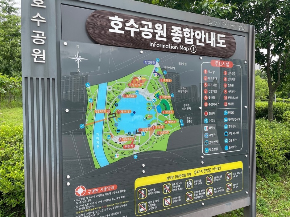 구래동 한강 신도시에 위치한 산책하기 좋은 호수공원이다. 남녀노소 누구나 산책, 운동, 가족 나들이하기 좋은 곳으로 시민을 배려한 공간들이 많다. 산책길 뿐만아니라 그늘막 텐트를 치고 쉴 수 있는 피크닉 존(허용 기간이 4월에서 10월까지)이 있으며 호숫가에는 억새와 바위들이 운치를 더하고 통나무 세모 집은 휴식공간을 제공한다.