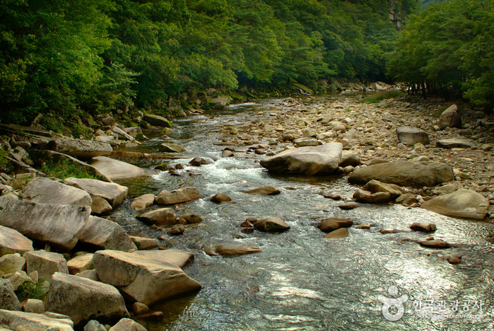 아치형 다리를 따라 그 풍경 안으로 들어가면 층층이 몸을 맞대고 있는 바위 아래로 계곡 물이 힘차게 휘돌아가는 모습이 보인다. 바위를 찰싹찰싹 때리며 흘러가는 계곡의 맑은 소리가 온 숲을 가득 채우고, 그에 화답이라도 하는 듯 멀리서 산새가 우짖는다.
